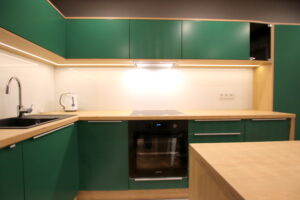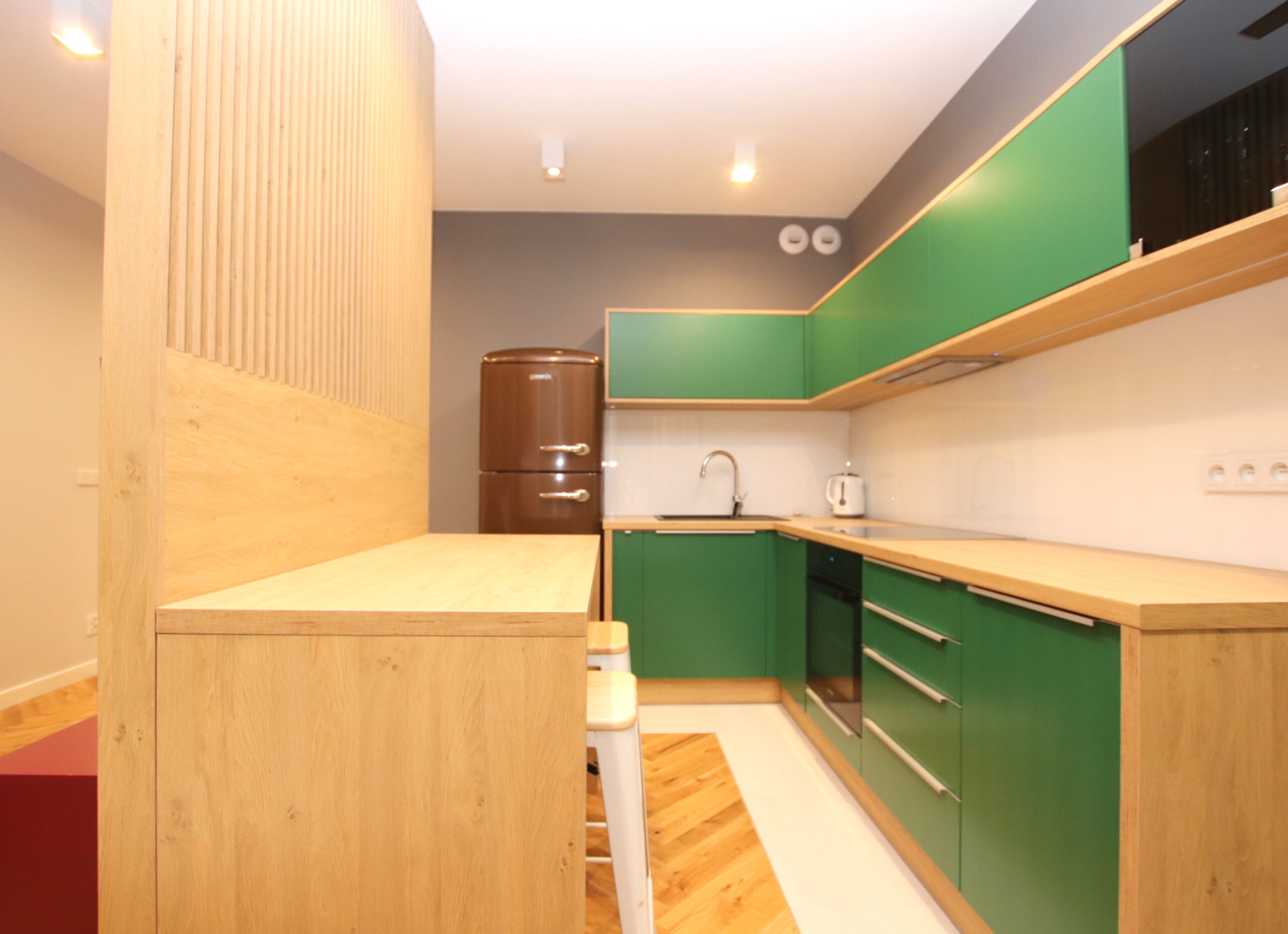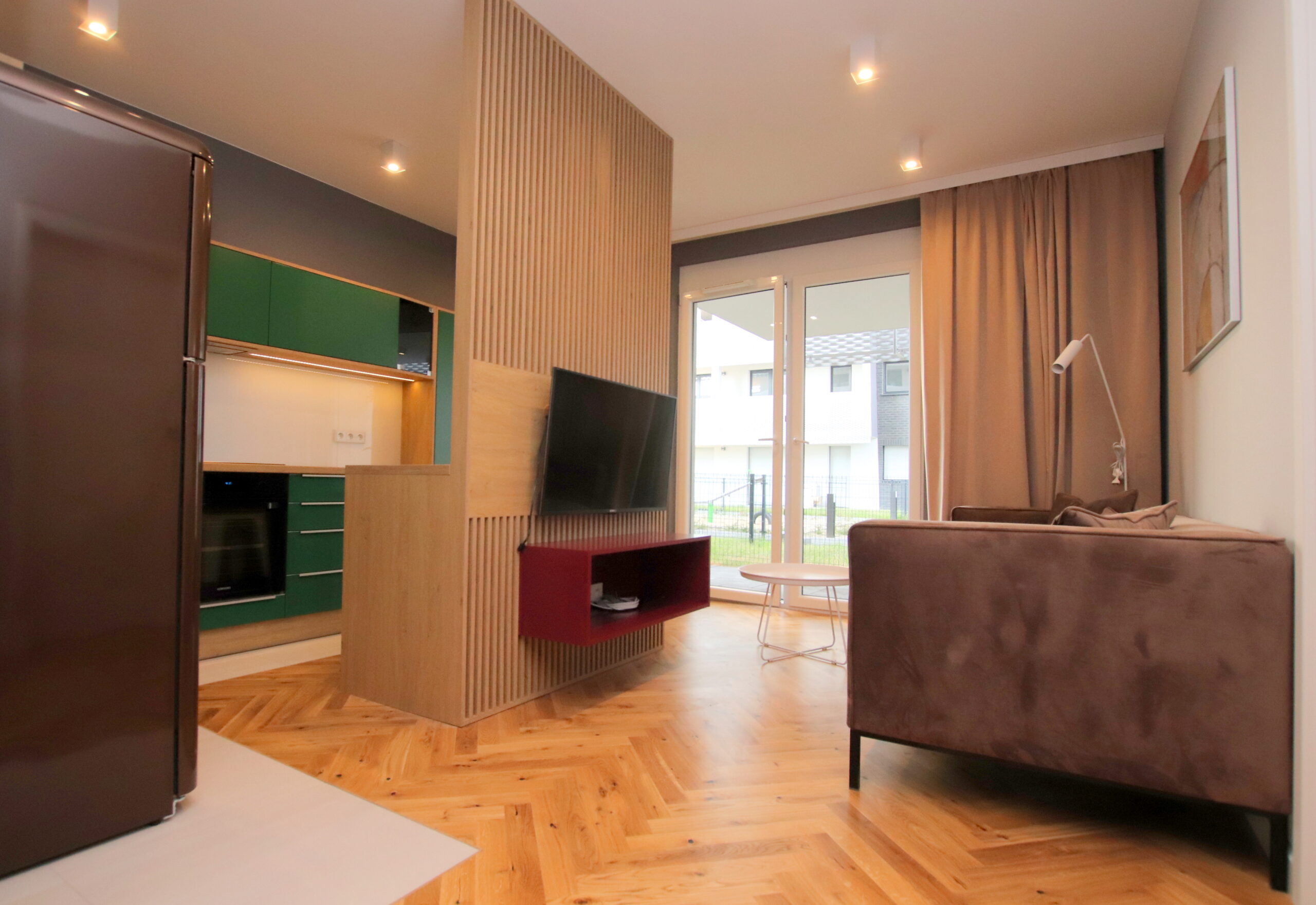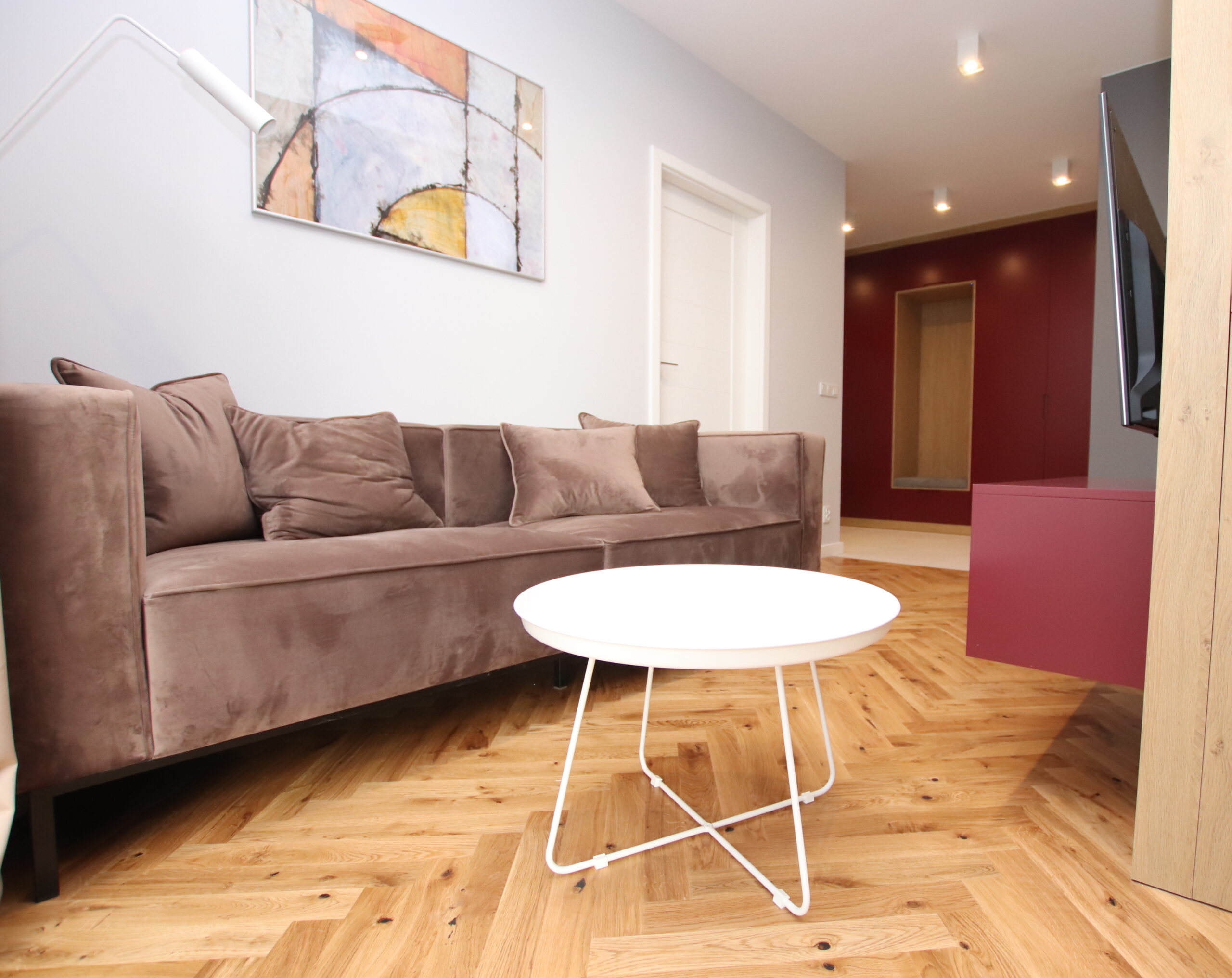 stylowe wykończenie wnętrz z dbałością o każdy detal: szczotkowany dąb na podłodze, drewniane blaty w kuchni, nowoczesna zabudowa oraz designerskie oświetlenie.